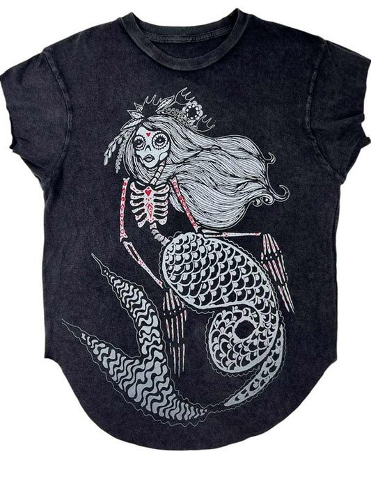 Side-Slit Tee - Oversized Skeleton Mermaid Print - Silvia