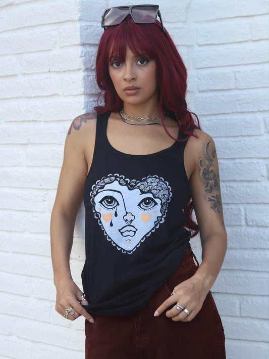Women’s Black Racerback Tank – Zoya Crying Heart Face