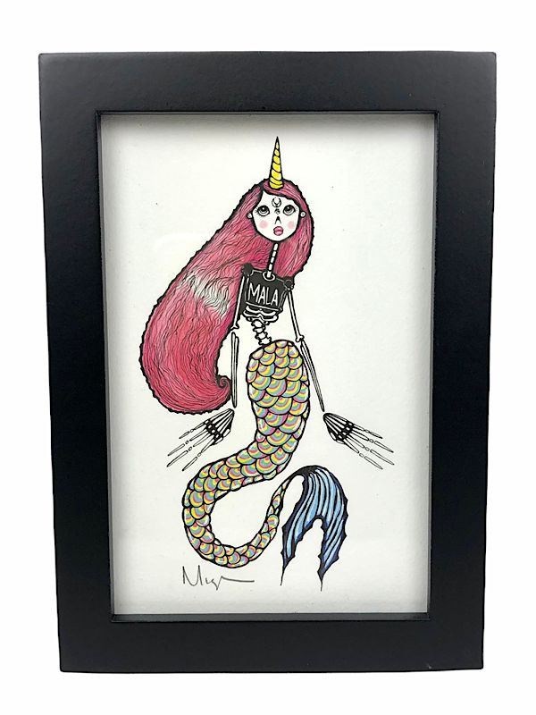 --Mala Muertos Mermaid Frame Art. This is a hand signed 4x6 original art framed print. Printed on a watercolor paper for a beautiful texture finish. With a perfect thin modern frame that you can hang on your wall or put on your desk.