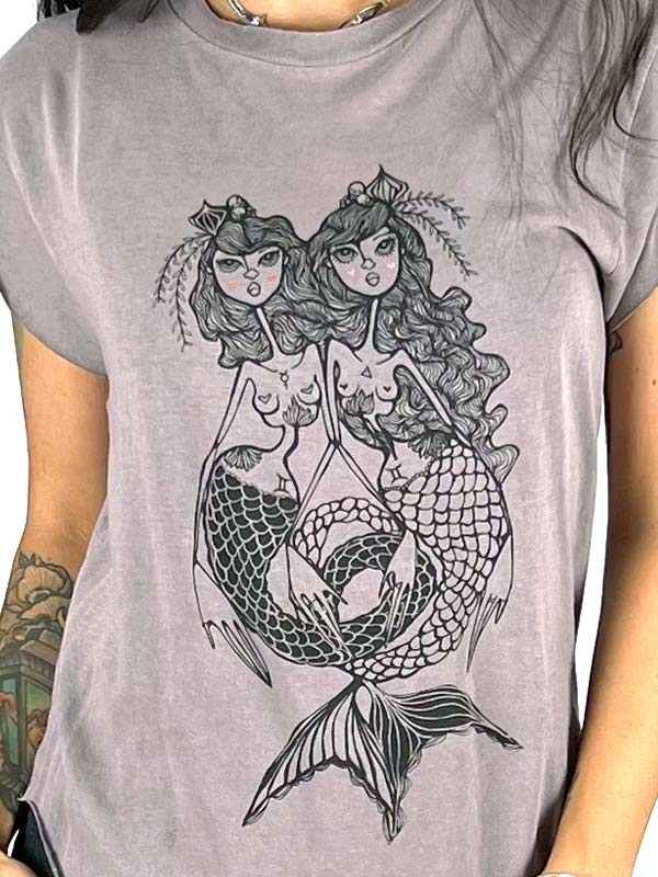 The Gemini zodiac mermaid artwork was hand drawn by Migdalia, and then screen printed in-house, one tee at a time. The vintage-inspired tee is printed in small runs, giving each shirt its own unique character. The comfy fit makes it the perfect addition to your graphic tee collection.