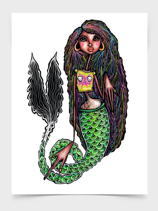 --Afro Latina Mermaid Sister. Colorful Funky, Representing Afro Latina Magic. This is a hand signed original 9x12 art print. Printed on a watercolor paper for a beautiful texture finish.