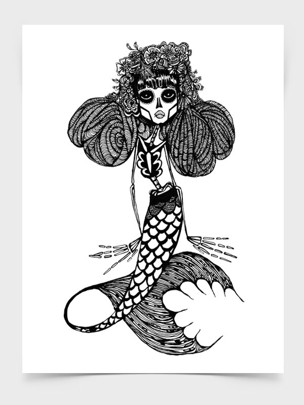 --La Reina Muertos Mermaid Art Print. The Original Day of the Dead Mermaid. This is a hand signed original 9x12 art print. Printed on a watercolor paper for a beautiful texture finish.