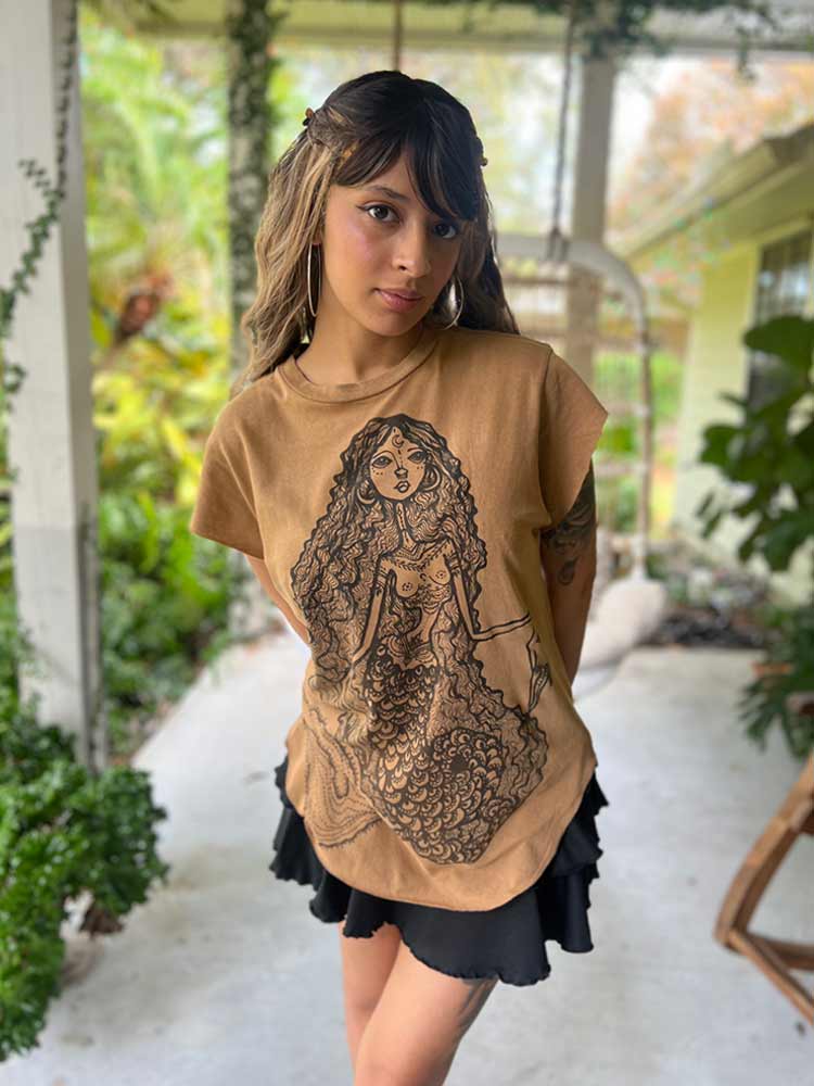 Meet Kezia, Migdalia’s hand-drawn mermaid brought to life with artistry and intention. Each shirt is screen printed by hand in small batches, so you’ll find subtle variations from piece to piece, making every tee as unique as Kezia herself. Crafted with care, this isn’t just a shirt—it’s a wearable piece of art made to stand out, whether you’re keeping it casual or going all out.