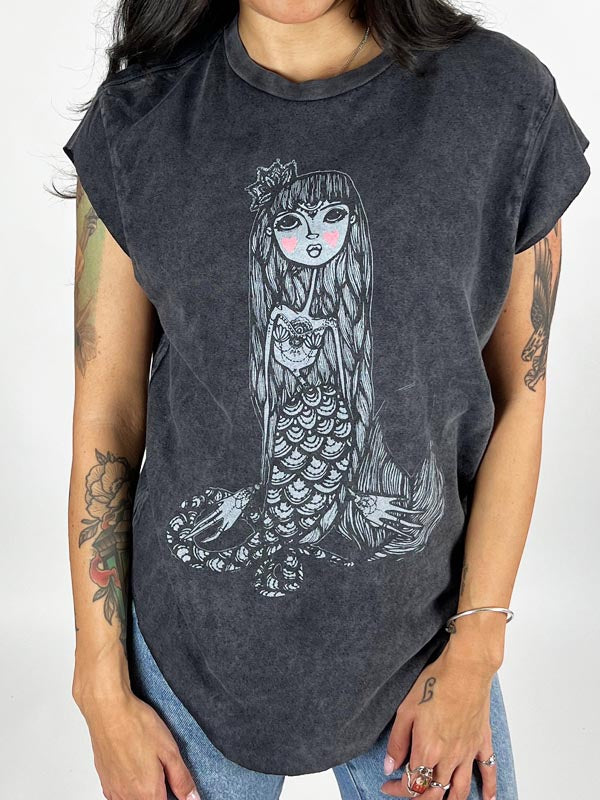 Migdalia hand-drew the mermaid design, named Henna Zella, and then screen printed her in-house, one tee at a time. Each shirt is printed in small runs, so the colors may vary slightly from shirt to shirt. But that just adds to the charm, right?
