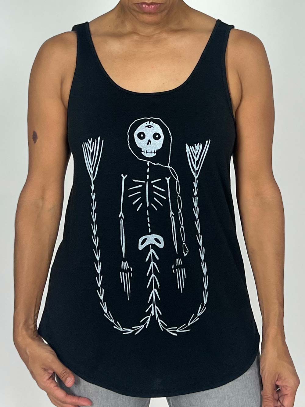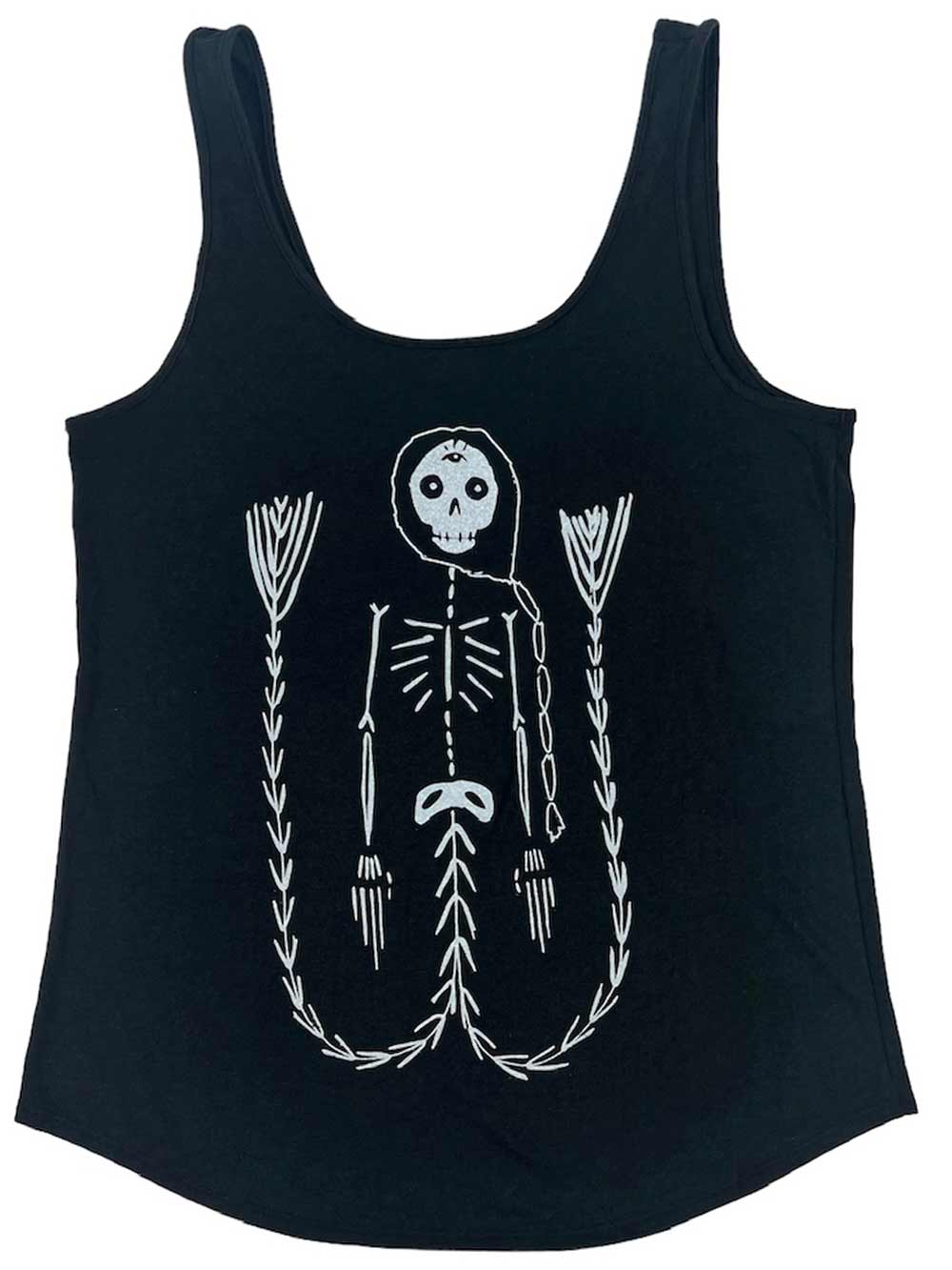 Say hello to your new favorite tank top—your summer savior, your layering legend, your brunch buddy. This is the Libitina, a skeleton mermaid, printed on a relaxed fit curve hem tank.