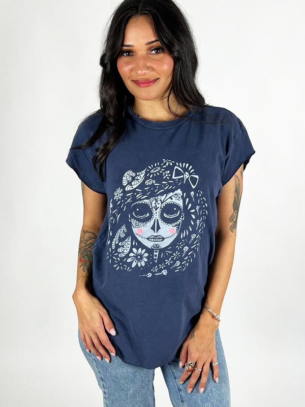 Migdalia hand-drew the Sugar Skull design, named Reza, and then screen printed her in-house, one tee at a time. Each shirt is printed in small runs, so the colors may vary slightly from shirt to shirt. But that just adds to the charm, right?