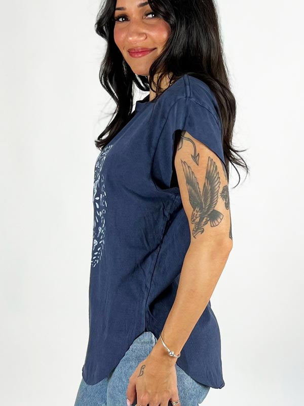 Do you love vintage t-shirts? Well, our boyfriend graphic tee is just like your fave old shirt! It's soft and comfy because it's made from 100% ringspun cotton. Plus, it's been "mineral washed," which means it looks and feels worn in, just like a vintage tee. And because each shirt is hand cut and stitched, it has a loose and comfy fit. Perfect for those lazy days at home or running around town in style!